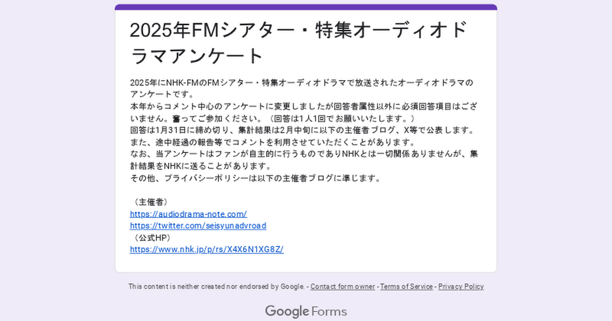 今年も採用サービスはGoogleフォームで、青春アドベンチャー編とFMシアター・特集オーディオドラマ編の2つに分けて実施いたします。